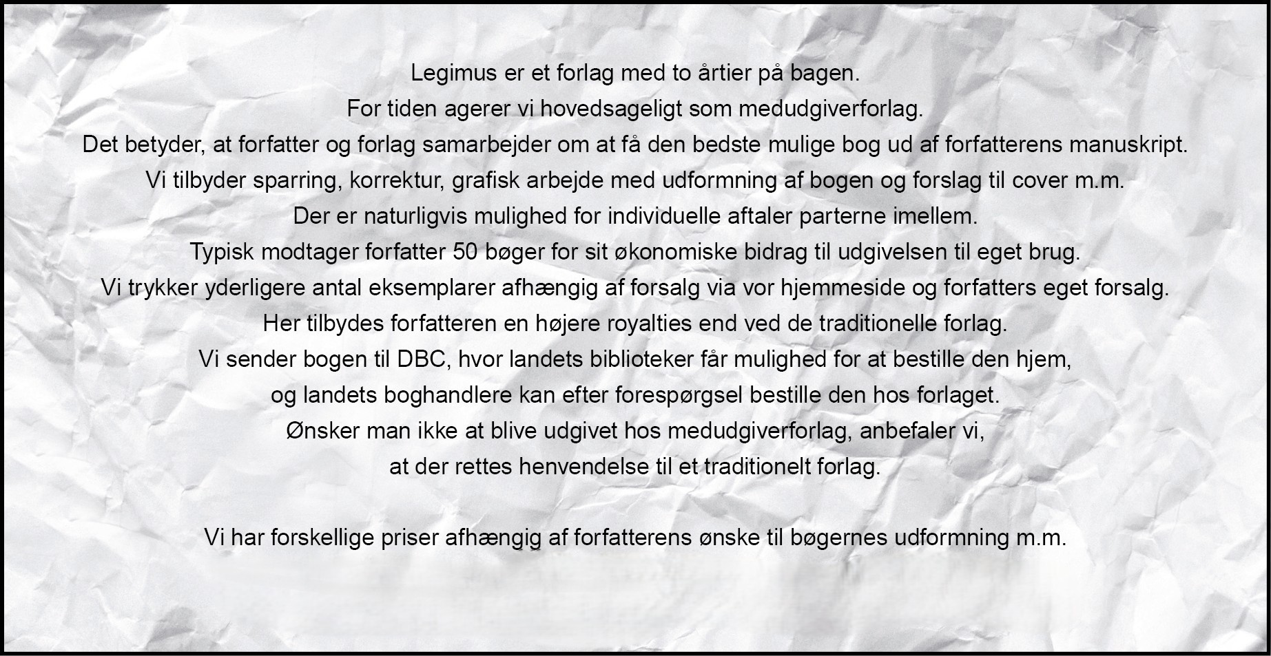 Hos Forlaget Legimus elsker vi fortryllende fortællinger og dramatiske højdepunkter. Derfor har vores udgivelser stor spændvidde.https://forlaget-legimus.dk/udgive-din-bog/https://forlaget-legimus.dk/produkt/forbandet-liv/ Nyeste Jamen, jeg har altså feber! 189,95 kr.Til kurv Ro på, det er blot en tanke 199,95 kr.Til kurv Pilgrim Initiativet 199,95 kr.Til kurv Slusetid 249,95 kr.Til kurv Sommerfuglenes sang 179,95 kr.Til kurv Amerika besat 199,95 kr.Til kurv En ny normal 199,95 kr.Til kurv Forbandet liv 229,95 kr.Til kurv Under Stormen 229,95 kr.Til kurv SIKKER Per i med og modWIND 259,95 kr.Til kurv TRYK HER FOR TILBUDS BØGERINSTITUTION BESTILLING:Er I institution og ønsker at betale via Ean-faktura, venligst send oplysninger og ordre på kontor@legimus.dkvores bøger kan købes hos: Alle førende boghandlere Salling og Magasin BiBi og Bogportalen www.saxo.com Husk, vi i shoppen modtager:Tæller